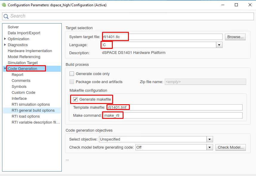 When creating the Simulink Model, in the Configurations, in the “Code Generation” tab, set the options (see Figure 6.6 below):