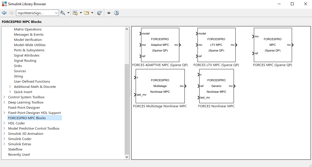 Figure 6.3 FORCESPRO MPC block in the library browser¶