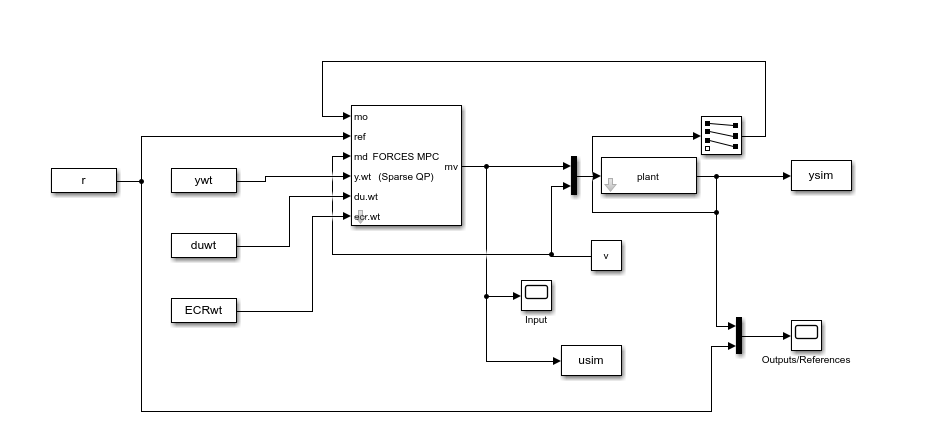 The FORCESPRO sparse QP solver is also available via the Model Predictive Control Toolbox in Simulink. A dedicated block has been implemented for this purpose. All features of the MATLAB plugin are available through this Simulink block, namely measured disturbances, external manipulated variables, references for manipulated variables,