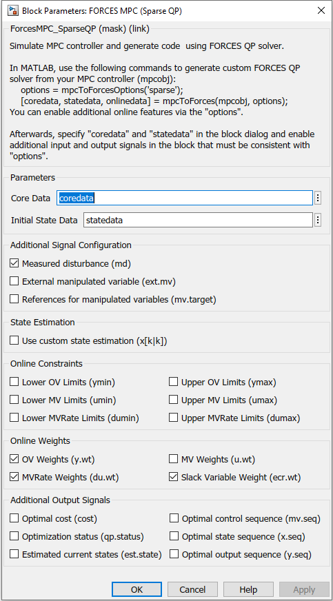 The structures coredata and statedata needed by the FORCESPRO solver are then provided to the Simulink block via the window shown in Figure 6.1.