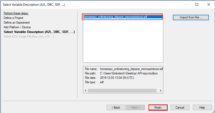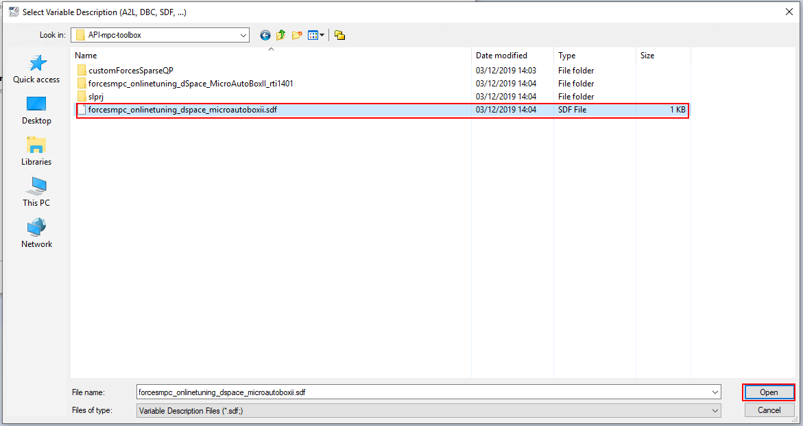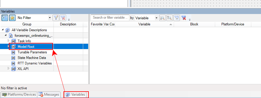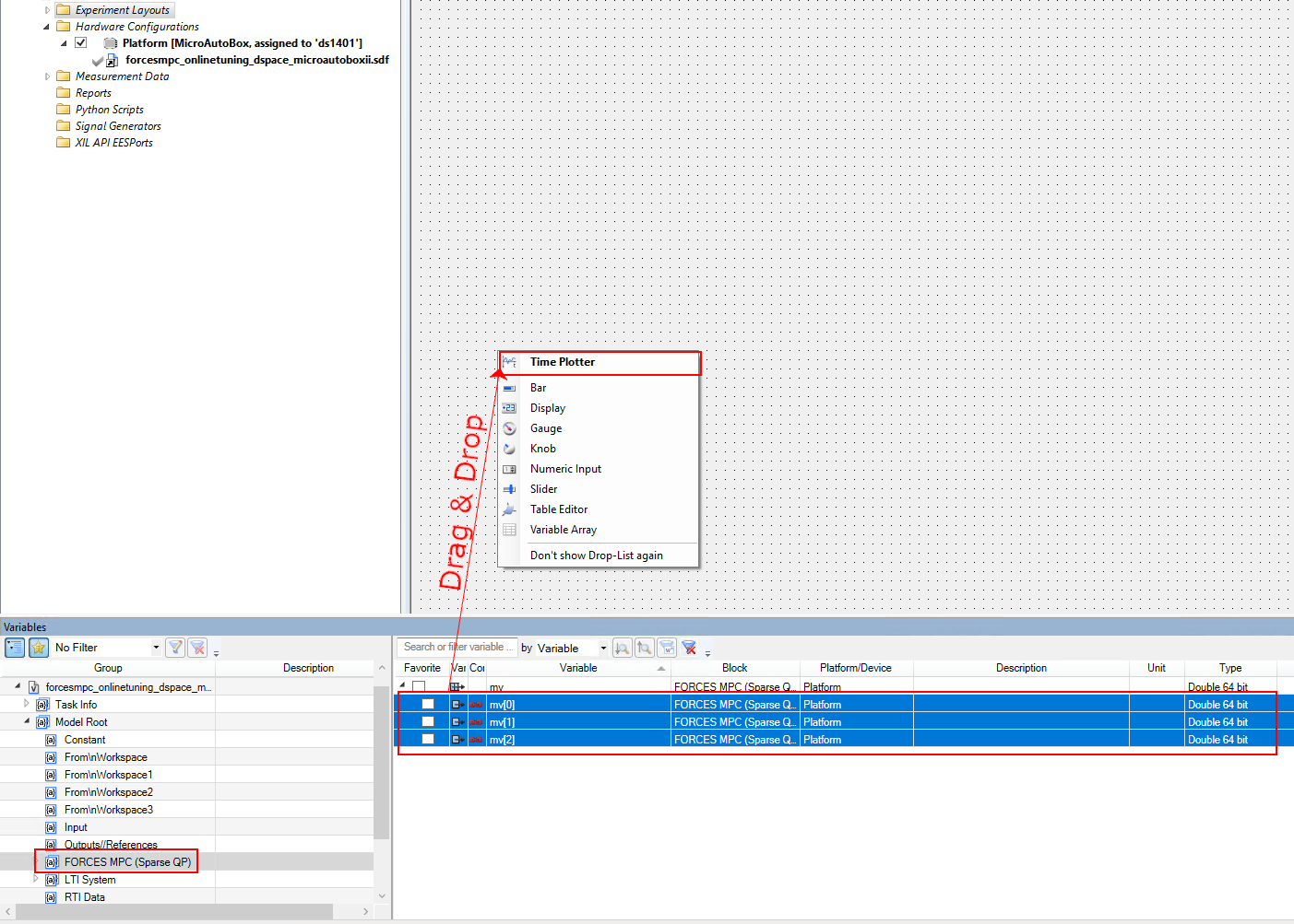 Import the variable description file forcesmpc_onlinetuning_dSpace_MicroAutoBoxII.sdf in order to have access to the model variables and see the results of the execution (see Figure 6.12 and Figure 6.13).