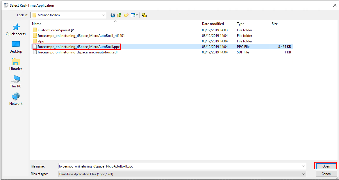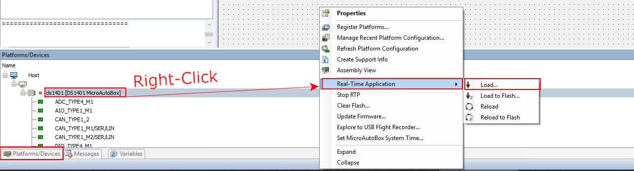 Select the Platforms/Devices tab. Right-Click on your platform and select Real-TimeApplication> Load. Choose the executable file forcesmpc_onlinetuning_dSpace_MicroAutoBoxII.ppc (see Figure 6.19 and Figure 6.20).